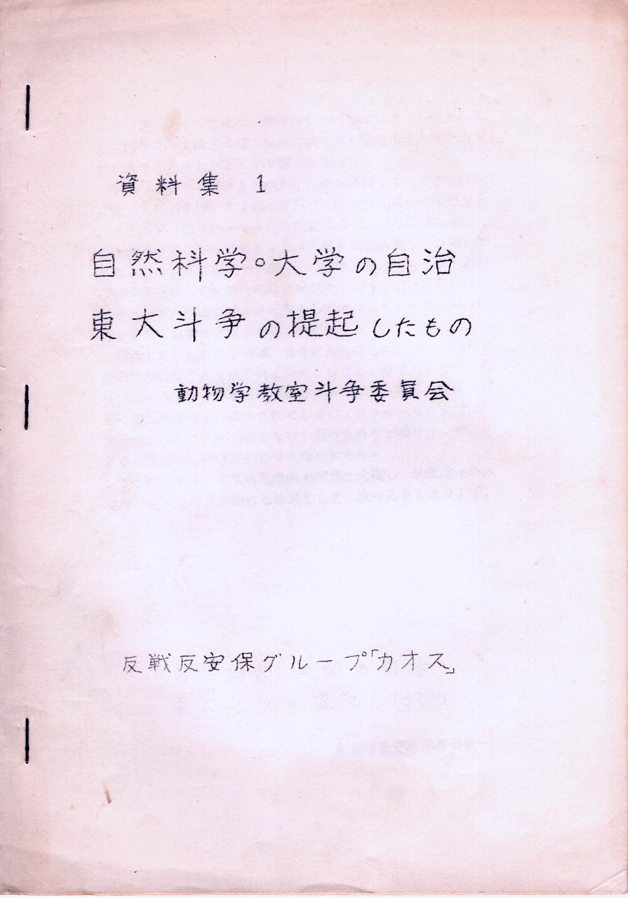 東大闘争が終息した後でも、これが提起した様々な問題を重く受け止める空気は残っていました。動物学教室でも、浅井正さん、井内一郎さんなどの大学院生が集まっていろいろと議論しました。そんな経緯で、「資料集1 自然科学・大学の自治 東大斗争の提起したもの」という16ページのガリ版刷りのパンフレットを発行したようです。手元に残っていました。発行元は動物学教室斗争委員会、反戦反安保グループ「カオス」となっています。奥付には1970年8月1日発行とあり、発行人は浅井正、編集人は和田勝となっています。ここでカオスという名前を使っているんですね。表紙の字は、間違いなく筆者のガリ切の文字です。