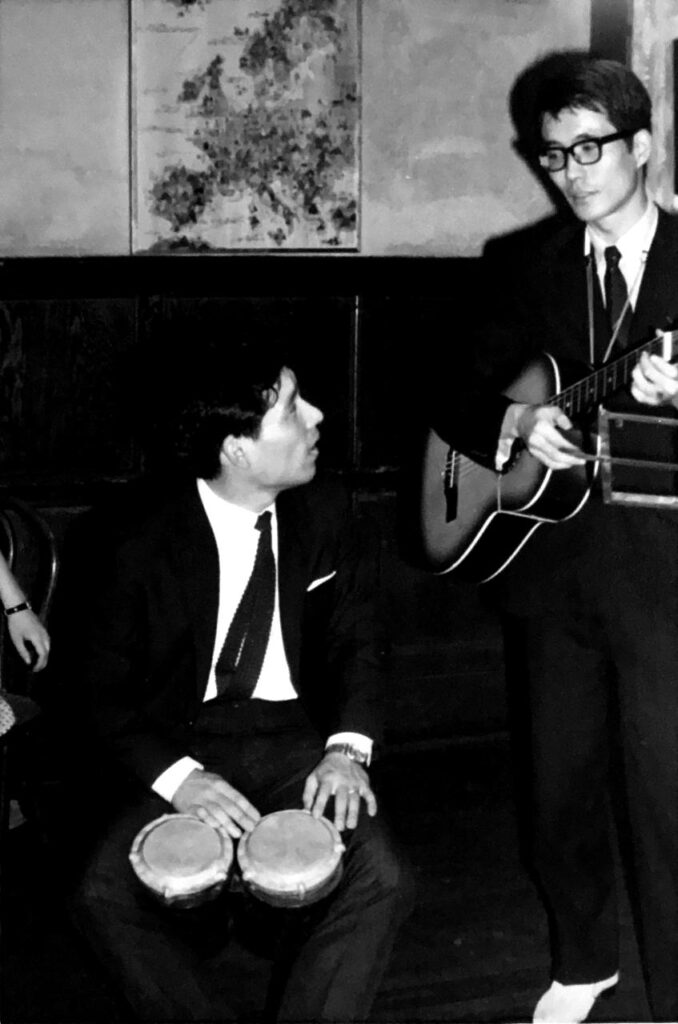 新宿高校からの友人、久保田光博さんがギターを持ち、彼の友人のベースを加えて音楽が入りました。筆者もなにか唄っていますが、何を唄ったか憶えていません。その次の写真では、駒場時代(二)で購入したと書いたボンゴで演奏に加わっていますね。