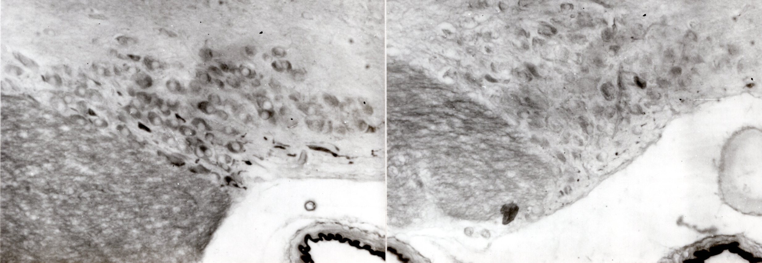 小林先生がドイツのギーセンにあるJusstus-Liebig Universityへ1970年に3か月の短期留学中に手掛けた、第三脳室の脳室上衣細胞が脳室から物を取り込んで正中隆起部へ運ぶことを証明する実験を補強するために、ウズラの第三脳室内にhorseradish peroxidaseを注入する実験を行いました。注入後5から10分でautopsyし、脳を取り出して視床下部をglutaraldehydeで固定し、バッファーで洗った後、凍結ミクロトームで厚切りの切片を作成し、 peroxidaseの基質を加えて反応させ、生じた不溶性の茶色い物質で peroxidaseの位置を確認するのです。上衣細胞とその突起に茶色い物質を確認でき、第三脳室内の物質を運んでいるように見える像が得られました。
